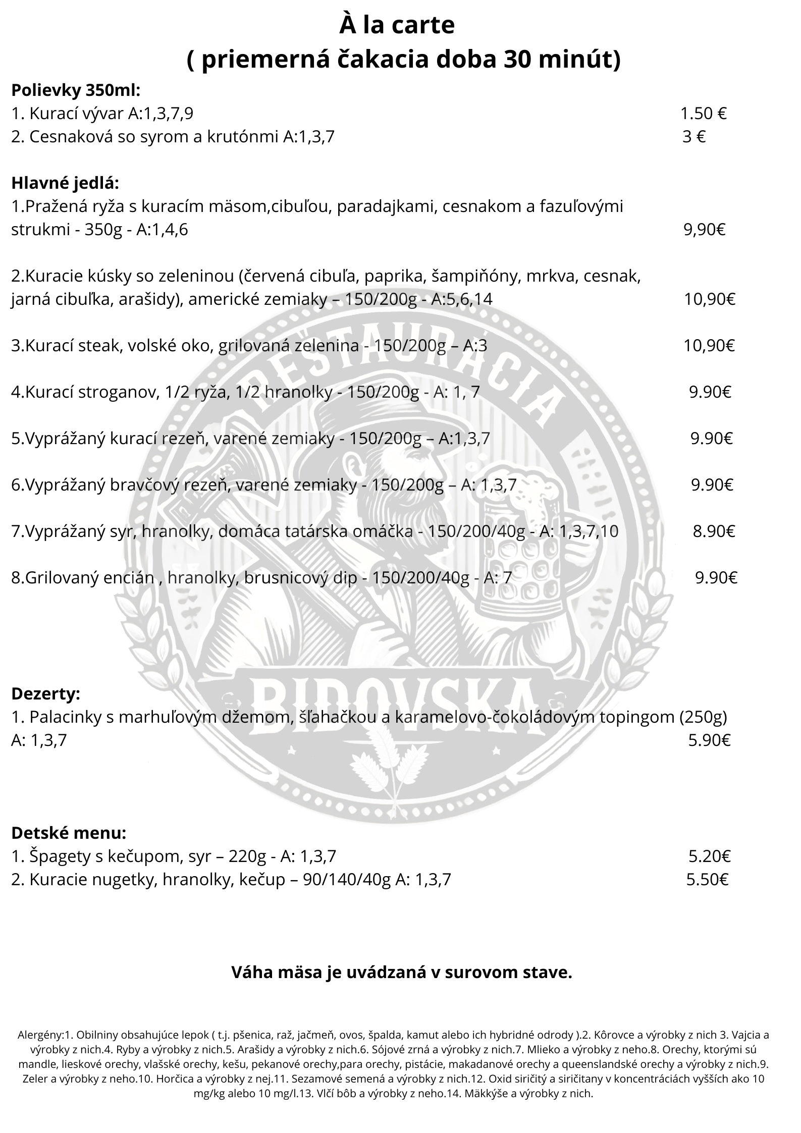 Sme reštaurácia, ktorá sa zameriava na prípravu tradičnej slovenskej a českej kuchyne. Varíme výhradne z čerstvých a kvalitných surovín, ktoré sú zárukou skvelého a chutného jedla. Náš koncept je postavený na tradícií nie len prípravy jedla, ale tiež čapovania piva.  Využívame systém NOSTALGIA, čo je staročeský spôsob správneho čapovania piva, ktorý bol v posledných rokoch zanedbávaný. Týmto spôsobom prinášame staré tradičné chute piva, ktoré prinášajú celkom nový pôžitok. Rovnako s veľkou starostlivosťou pre vás pripravujeme kávu so 150 ročnou tradíciou, ktorá je  bohatá na komplexnú chuť, ktorá uspokojí aj tých najnáročnejších milovníkov kávy.